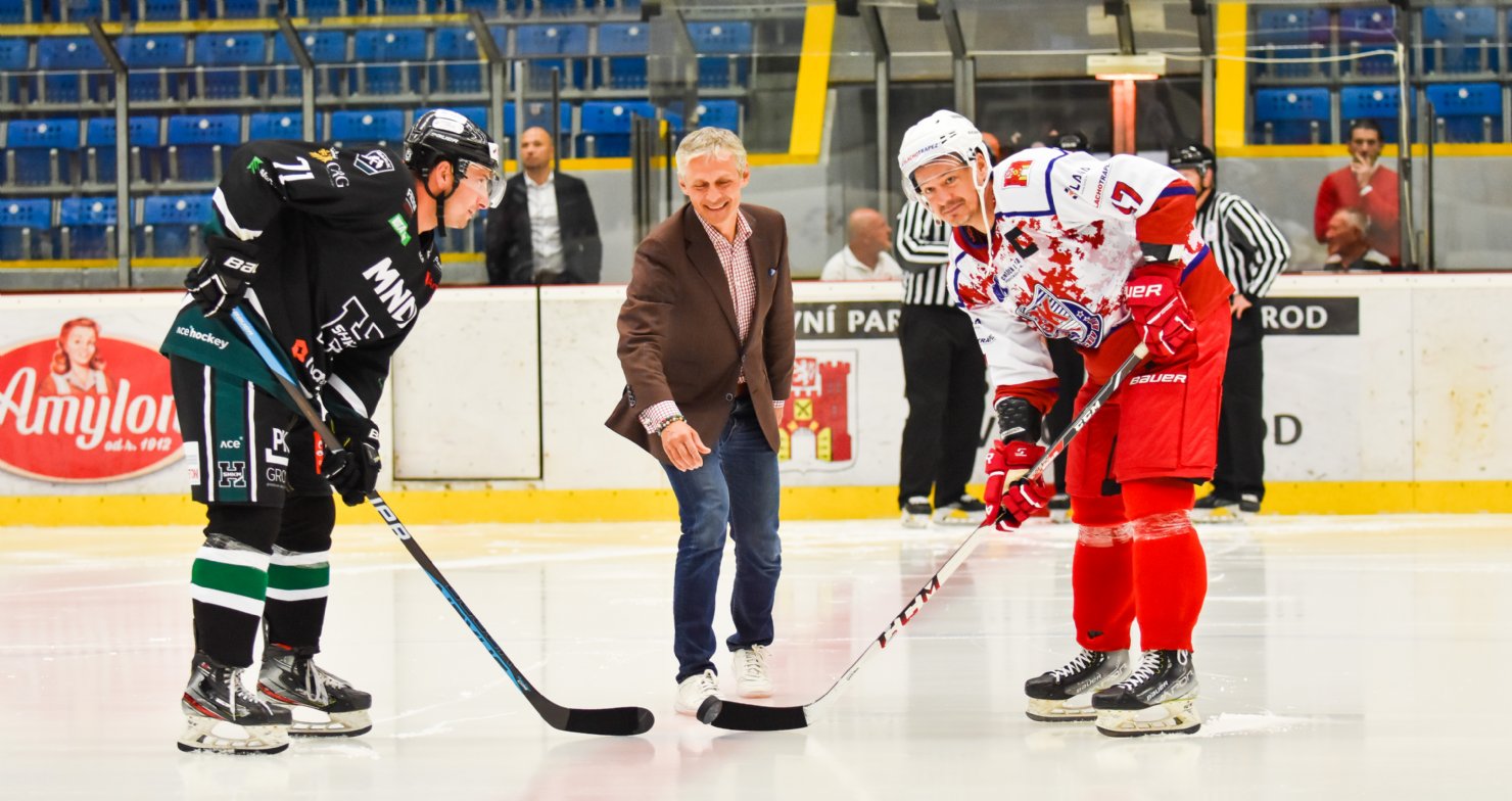 Kapitán Jan Novák (vpravo) na úvodním domácím buly nové sezóny. (foto: bkhb.cz)
