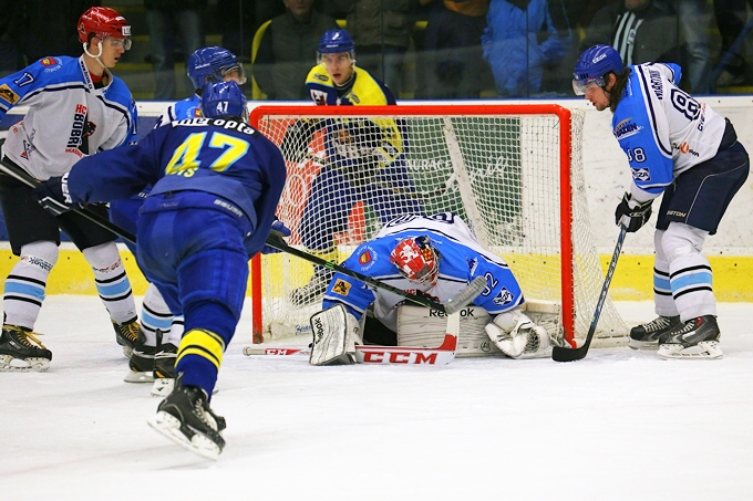 Jiří Goiš v jednom z posledních zápasů za Přerov proti Valašskému Meziříčí. V té době dres Zubra oblékal brankář Jiří Slovák ale také bývalý extraligový gólman Martin Vojtek, nebo reprezentant David Šťastný. Foto: hokejprerov.cz