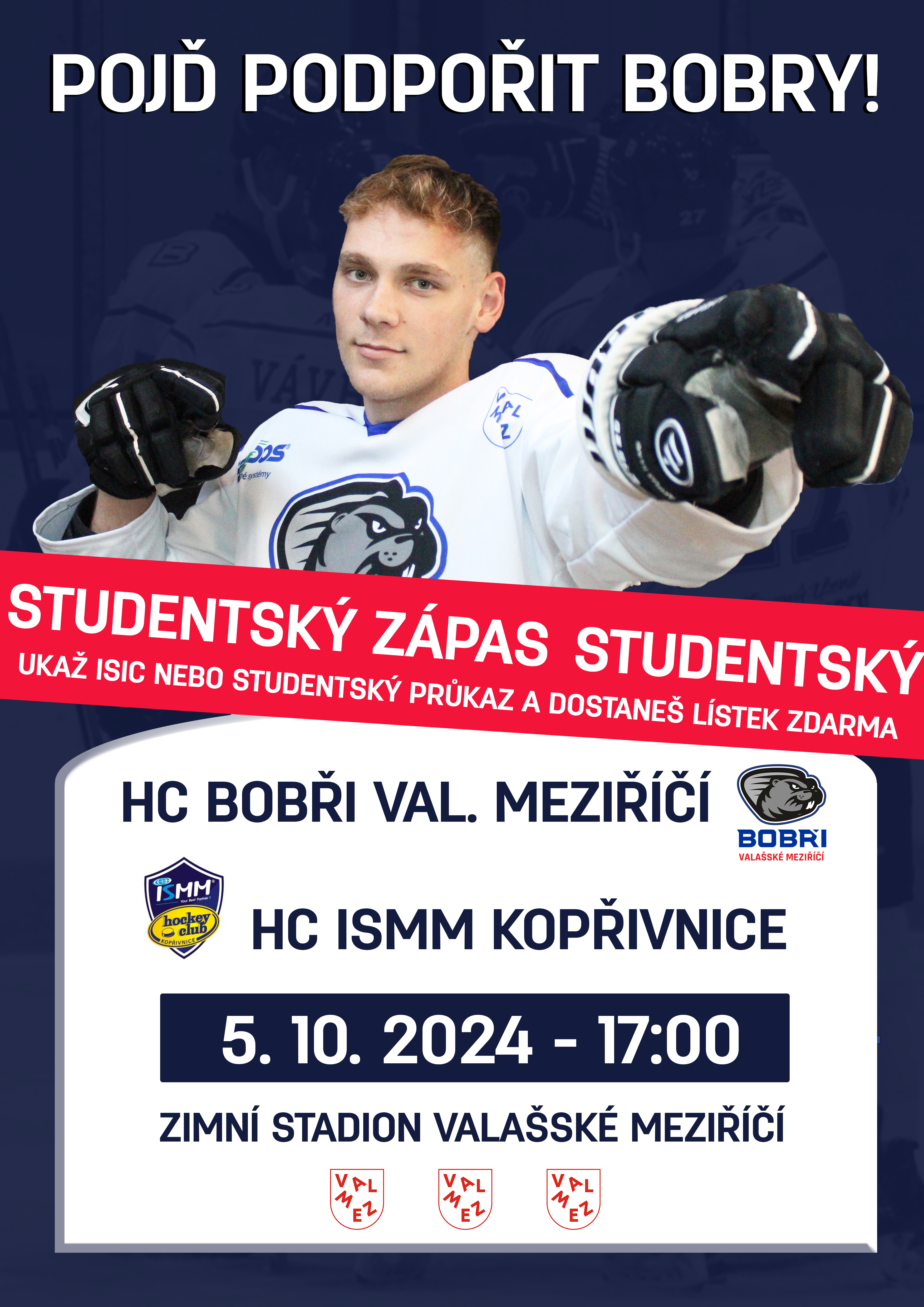 Hokejový klub Bobři Valašské Meziříčí připravuje na sobotu 5. 10. 2024 speciální akci. Všichni studenti budou mít po předložení studentské karty nebo karty ISIC vstup na zápas zcela zdarma.